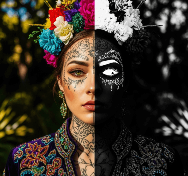 A la izquierda, un retrato fotográfico complejo, lleno de color y detalle. A la derecha, la misma imagen procesada con un alto contraste en blanco y negro, donde solo las luces más altas y las sombras más profundas son visibles, revelando la estructura fundamental de la composición.